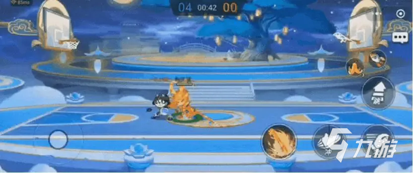 齐天大圣的主动技会召唤出定海神针将附近的敌人给全部砸碎,再次点击可以将其召回,自身朝着金箍棒冲锋并持续牵引周边的敌人,这项技能可以说是他最为强大的主力,在很多情况都能使用,比方说在敌人打球宝时争抢球权,在敌人灌篮时进行打断等,不过大家用的时候要注意好金箍棒的释放距离只有四分之三场距,千万不要脱离距离,不然可能会直接影响到最终效果。
