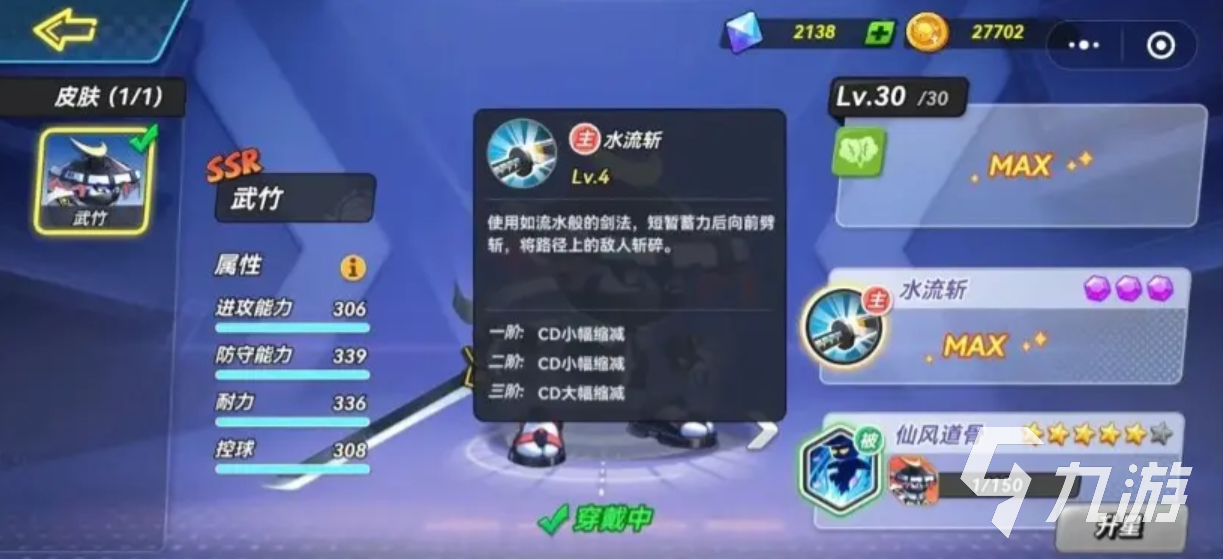 主动技”水流斩”,使用高超的剑法将对手斩击再低,如果对方手中有球,此时球也会掉落。普攻区分为三段,和大部分其他角色一样,第三段会将对手击倒,不过也有不同之处,就是他的普攻三段会附带小范围突刺,给予对手意想不到的一击。这个角色的短板就在空中,空中打击速度比较慢,因此培养时这方面是需要格外注意的。在各类SSR角色里面,他属于比较平衡的,可以着重去培养进攻能力,主动技用来防守也不错。