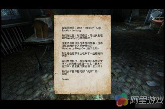 在大厅旁的一件屋子里,Person找到了一张破旧的日记残页,看来有一段时间了,纸张的颜色已经泛出淡淡的焦黄。纸上的内容出自一个名为Saskia的人之手,读完上边的内容,Pearson深深叹了一口气。看来他们曾把这里当作废墟进行过探险,而且他们还知道这里住着一个“疯子”!然而Pearson并不知道这个疯子究竟是谁,只是在心中默默的记住了这个名字。