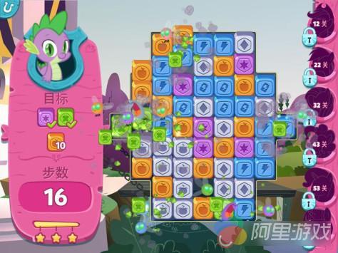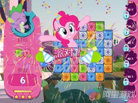 《彩虹小马:益智派对(My Little Pony: Puzzle Party)》采用关卡模式进行,每个关卡都有不同的任务,只有在规定步数之内完成任何才能过关,比如消除XX数量的方块、将XX道具移动到屏幕最底端、以及消除指定的道具等等,不过这些任务在其它同类游戏中也比较常见,并没有太多新意。不过随着游戏关卡的深入,我们还可以解锁出各种小马驹,它们也会使用自己的技能来帮助玩家过关哦。