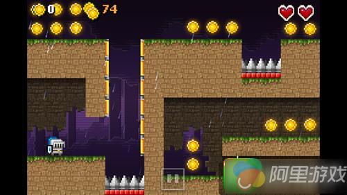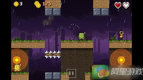 自动前进的好处在于节省了玩家的操作,但不好的地方也尤为突出,在你遇到暂时无法想出解决方法的区域,你不知道应该跳跃还是加速,而人物却无法停止,这是最纠结的地方,但同时也是游戏最有趣的地方。除了一些你不知道如何才能完美通过的地段,那些敌人和尖刺也是你应该考虑的难题,如果你碰到敌人,将会损失一个血,两次重新再来,而如果是尖刺,就只有一次机会了。而在游戏里,玩家将不止一次的遇见在尖刺两边巡逻的敌人,一次完美的冲撞跳跃看起来像是解决这类难题的最好方法,前提是你已经胸有成竹。
