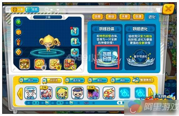 首先选中可以合体的妖怪,点击进化选项中的妖怪合体就可以进入合体界面啦。