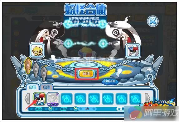 选中要作为素材的妖怪,点击合体按键就可以合体啦,合体界面的中央可以隐约看到合体后的妖怪样子呢。