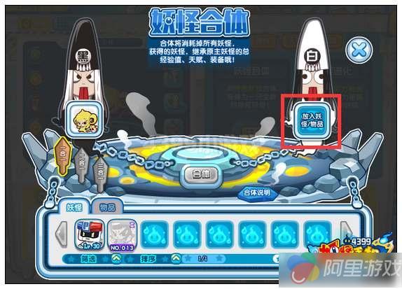 点击图中红框选择合体素材,合体素材可能是特定妖怪也可能是特定物品,而作为素材的妖怪等级必须达到30级才行哦。