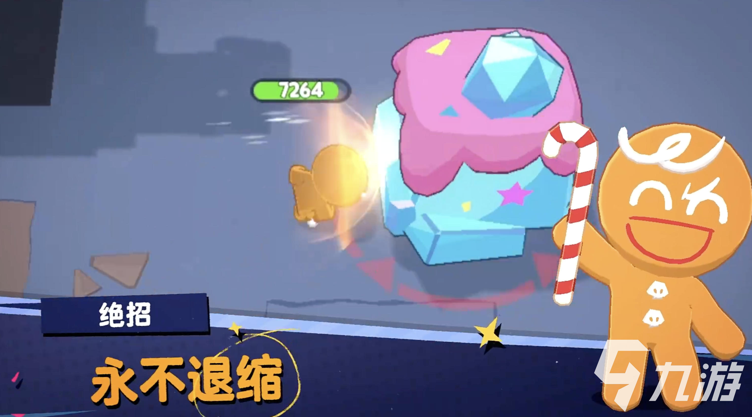最后是绝招【永不退缩】,这是勇敢饼干的核心爆发技能。他会先冲向前方造成伤害,然后跳起再用拐杖糖砸向地面,打出范围AOE,这个技能是清怪和打团的利器。