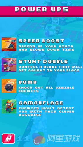 游戏对于忍者的设定,相比起其他影视动漫作品或者是游戏来说,显然要专业的多。本作的忍者并非是拥有各类“血继限界”或者“高深忍术”,而是能够通过灵敏的身手去完成一些常人无法完成的工作。游戏中的忍者善于隐藏,可以躲在树林或者水中不被红色视野观察到。不过需要注意的是角色在水中的移动会有一个短暂的延迟,这一时间会被机智的敌方随从发现,成为玩家的全新障碍。此外,玩家还可以通过商店购买忍者技能,目前一共有四个技能,分别是加速、分身、炸 弹和伪装。玩家可以自行选择。