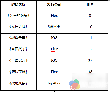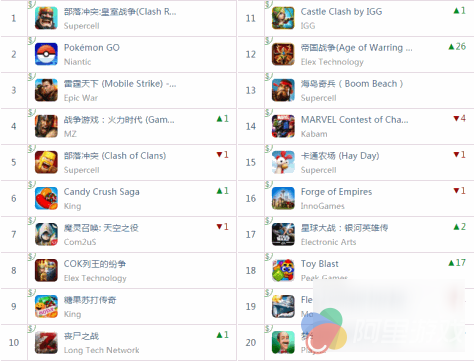 11-12名同样是国产游戏,分别是IGG的《城堡争霸》和刚更新了新版本,上升26位的Elex的《帝国战争》,Supercell的《海岛奇兵》和《卡通农场》也在前20之内,分别拍13和15位,Kabam的《漫威 冠军之争》排在第14。德国的本土游戏《Forge of Empires》排在第16位,EA的《星球大战》排在第17位,《Toy Blast》 上升17位排在第18名,排在20的则是Playrix的《梦幻花园》。