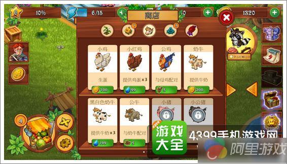 游戏为玩家们准备了非常丰富的农场道具和建筑设施,玩家们可以通过完成任务或者出售农作物来获得金币,然后购买更多农场物品,包括饲料机、谷仓、工具棚、搅拌机、厨房等,也可以购买一些动物,例如鸡、牛、猪、羊、鸭、马、狗熊、鹿等。游戏中只要玩家们有足够的金币,就可以购买到称心如意的东西,然后不断扩大发展自己的农场事业,做一个忙碌而幸福的农场主。
