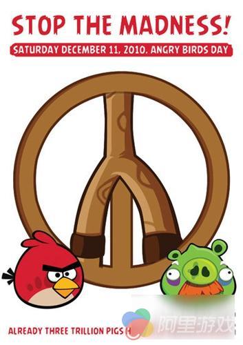 看起来,鸟和猪们的“偷蛋”不共戴天之仇是难解了,但是也有统计称,很多人十分喜欢猪,Rovio Mobile 曾经甚至赋予“反战”含义在英国伦敦举办了第一届“愤怒的小鸟日”,主题就是“反战”,并给这个活动设计了专门的标志:传统的“反战”标志被改成了“愤怒的小鸟”版,主体是一把弹弓和红鸟,以及猪头,口号是“停止疯狂的行为!”、“在 2010 年,已经有 3 万亿只猪头被害!”等等。