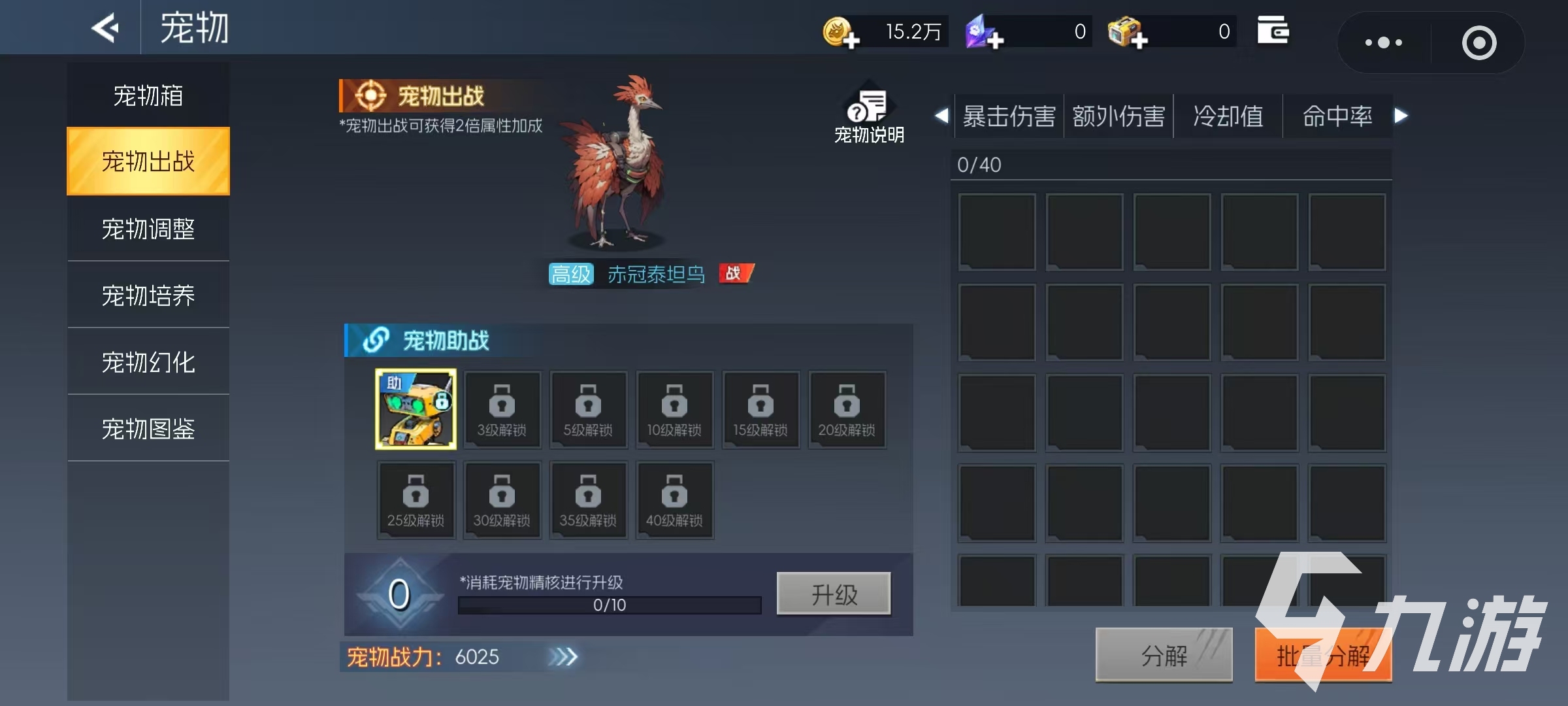 有了宠物之后需要做的就是让宠物出战,只有出战位置的宠物才能获得重点属性和主属性的额外增幅。除了出战位置还有助战位置的宠物,助战宠物只能激活重点属性和主属性。宠物的品质越高,重点属性和主属性的加成就越高,所以尽量选择当前品级最高的作为主战。宠物可以通过进行培养来提升等级和星级,提升之后属性能得到大幅度的攀升。也可以在培养的时候对宠物进行锁定,锁定之后的宠物无法被分解和赠送等操作,防止误操作。