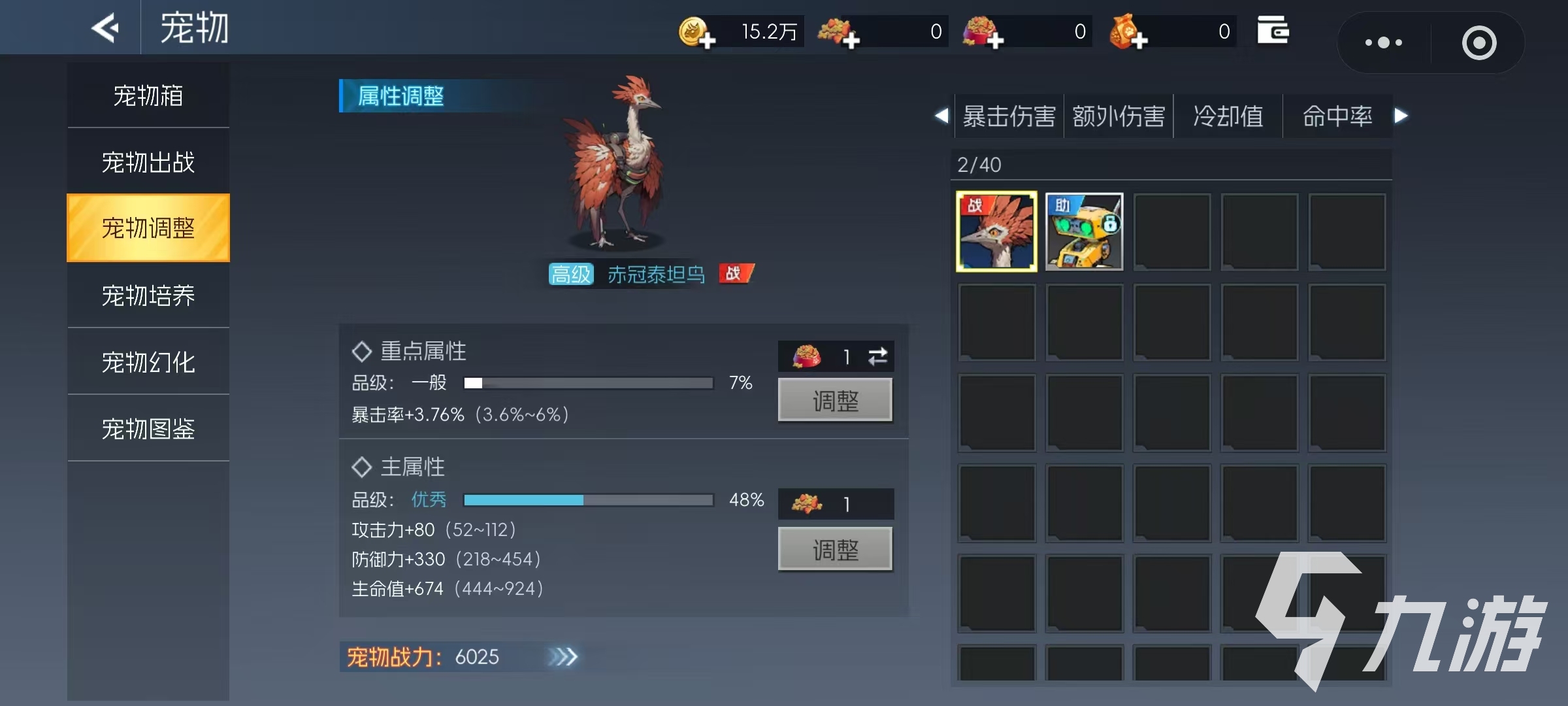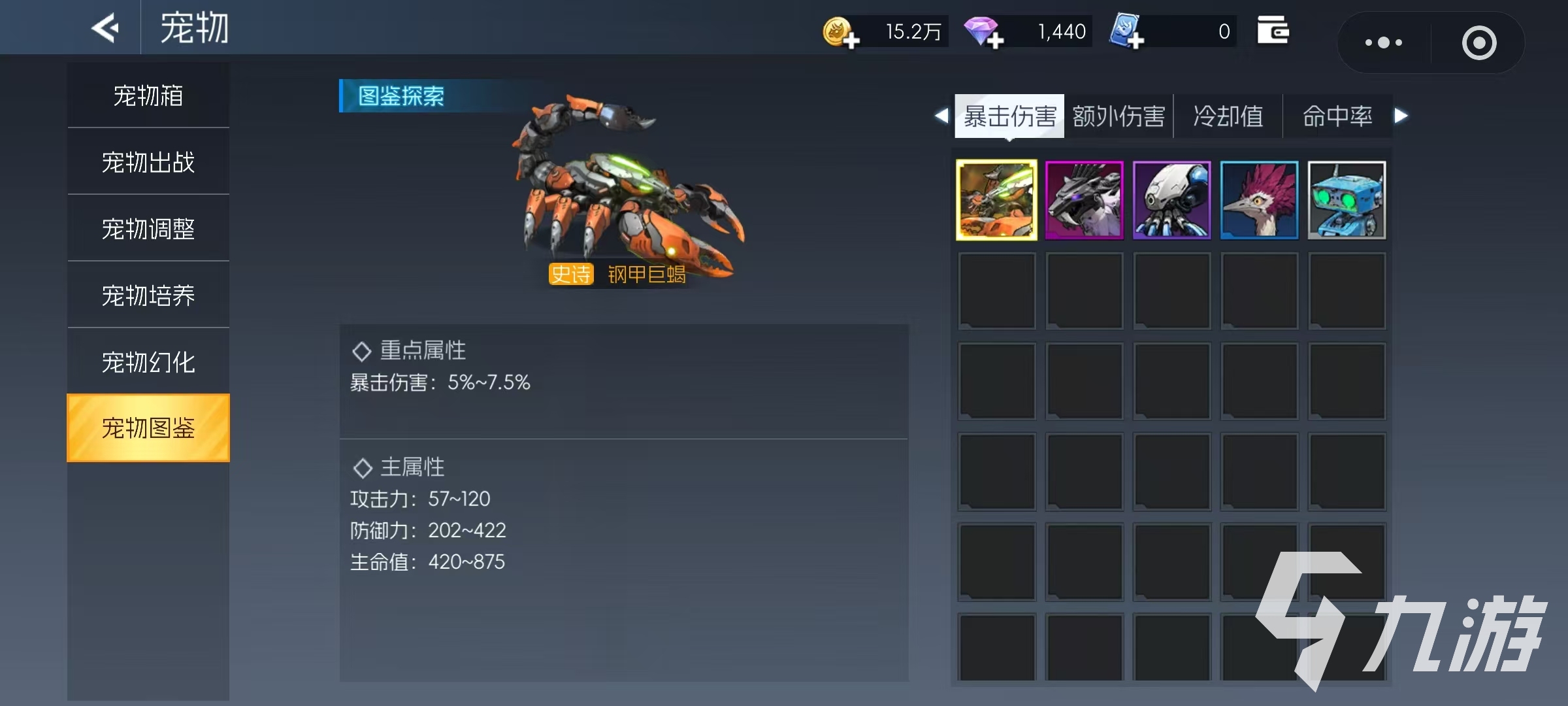 如果对当前宠物的属性不满意,就点击宠物调整,在这里可以对属性进行调整,力求得到最适合自己职业的属性。至于如何去选择宠物,也需要根据自己的职业来确定,宠物主要是按照提升到属性进行划分,分为暴击率、暴击伤害、额外伤害、冷却值和命中率这几大类。如果职业需要频繁释放技能,就可以选择能降低冷却值得,如果职业需要增加命中率,就选择重点属性可以提升命中率的。对于大多数职业来说,最有性价比的还是提升暴击和暴击伤害,这才是属性的重要来源。比较适合的宠物有钢甲巨蝎、钢牙剑齿虎等。