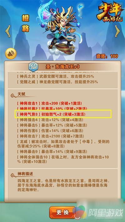 通过强化神将宝物到10级,武将可获得初始怒气+1的效果。