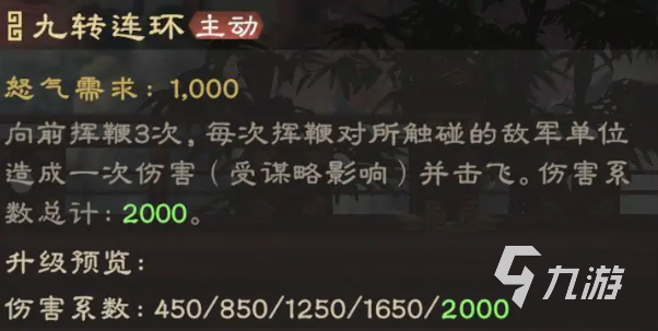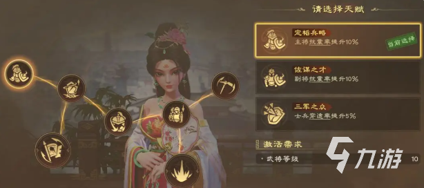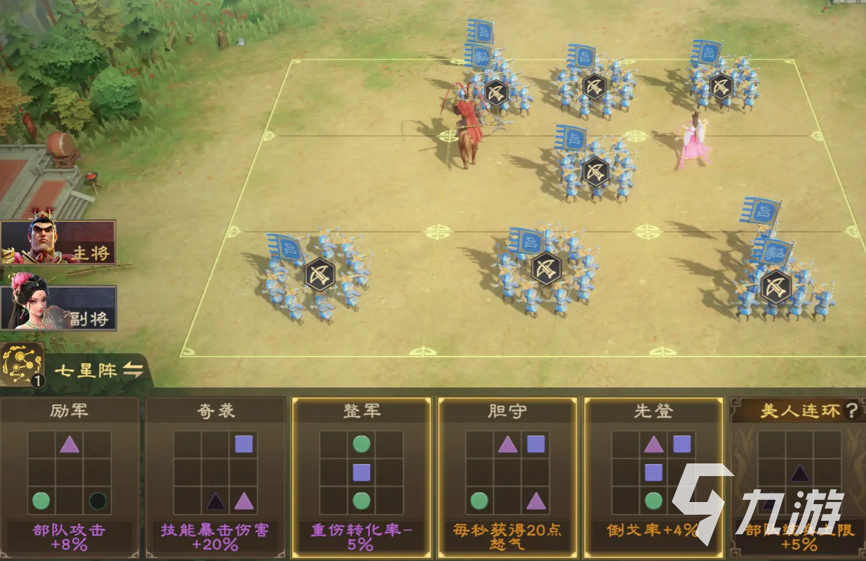 技能升级方面,建议优先去提升怒气技,两个核心被动可以同步提升,后续有资源再提升美人计的等级,为部队带来更高的攻击力,阵法可选七星阵,这能在普攻后概率提升怒气技伤害,同时还能通过“胆守”来获取到怒气,提高主动技的释放次数。