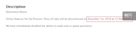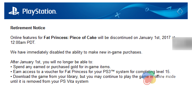 索尼将在明年1月1日关闭《胖公主:蛋糕块》在iOS和Android平台的联网服务,同时也通过邮件通知了PSV用户关服的消息。游戏内购买通道目前已经关闭,玩家也不能通过已经付费获得的金币来购买游戏内的道具。玩家在关服后可以通过离线游戏的方式继续游戏,但是玩家删除游戏后,将不能在商店下载。