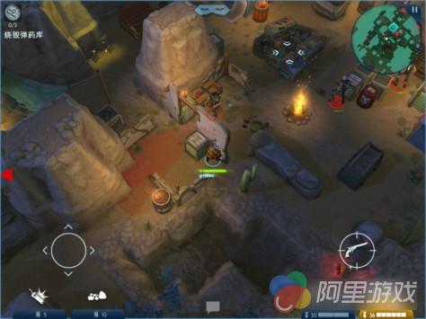右摇杆设计成了准星的样子,显然就是和武器及设计相关,只要点住右摇杆,主人公会举枪瞄准(主人公的正前方会出现模拟弹道来告知玩家是否瞄准及弹道覆盖范围),随着手指的移动调整瞄准方向,当手指松开便可以射击。同样,如果要取消射击,只需要将手指移回摇杆正中央,再松开即可。