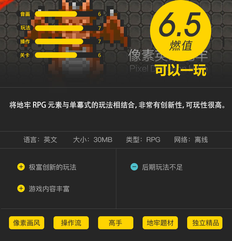 这是一款像素地牢冒险游戏,地牢中各种怪兽和Boss需要你来击败,简单的按键操作,上手容易,是休闲时不错的游戏选择。