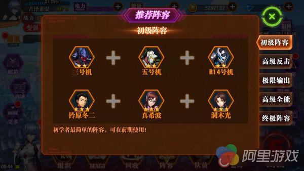 推荐阵容共有五种,分别适用于不同水平,不同性格的玩家朋友们。其中最为基础的初级阵容,堪称是每一位初学者都适用的最简单的阵容,铃原冬二、真希波以及洞木光三位驾驶员搭配各自最合适的EVA机体,激活共鸣,不仅具有不俗的伤害表现,其生存能力也得到了大大提升。在尤其是在初期阵容中,三号机单体伤害最高,R14号机拥有强力的大范围全体技能,而五号机则凭借着强大的生命回复能力成为团队坚实的后盾。这样一套攻守兼备的阵容,作为小白的你还不赶快mark起来?