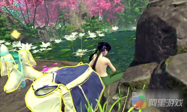 演示内容是从李逍遥初到仙灵岛的情节,没错就是那段灵儿沐浴的经典场面。玩家按照箭头和指示前行,其中有挥剑砍藤蔓,推石块,打怪等基本操作,整体看起来还是比较简陋的,再经历了一番波折后,循着灵儿《蝶恋》的歌声就可以看到经典的灵儿沐浴镜头。
