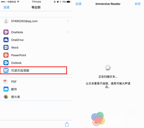 输出页面上列出了《Office Lens》支持的工作方式,包括 Microsofe Office 的 Word、PowerPoint,还有 Outlook 以及跨平台的 OneNote 和 OneDrive 同步。此外也可以保存为 PDF 格式文件保存或发送。另外,新版本更新后,现在我们可以看到新加入的沉浸式阅读器了。