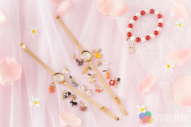 手表是1万5984日元(约合人民币1002元)一只,分为两款。一款是“宴”主题,由小透、夹、由希、泼春、红叶、依铃、乐罗为一组。另一款是“绊”主题,由紫吴、杞纱、波鸟、绫女、灯路、利津、红野、慊人为一组。手串是6264日元(约合人民币393元)一串,吊着架的挂坠