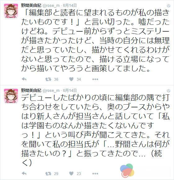 多年之后,野间可以大方地承认,这句话当然是谎话。她从出道之前就一直想画推理漫画,但她知道当时的自己并没有那个实力,编辑部也不会让自己在少女漫画杂志上画什么推理。所以她就从长计议,决定先努力达到能够画自己想画的作品的地位,再去实现自己的心愿。