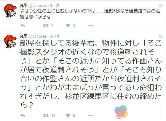 这位后辈当然看穿了这些前辈们的不良居心,继续另找住处。然而在公司附近的杉并、练马虽然可租的房子不少,他却哪一家都不敢选——“这家离摄影工作室太近了,感觉走夜路的时候会被捅”“这家附近住着我认识的作画,感觉走夜路的时候会被捅”“这家和相识的作监是邻居,感觉走夜路的时候会被捅”……是有多少人盯着你的性命啊?