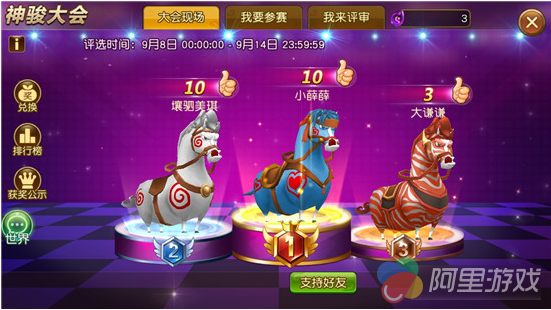 神骏大都会评审时间会持续一周,期间玩家可以通过“点赞”、“送花”、“砸翔”为不同的战马增减点赞数。评审结