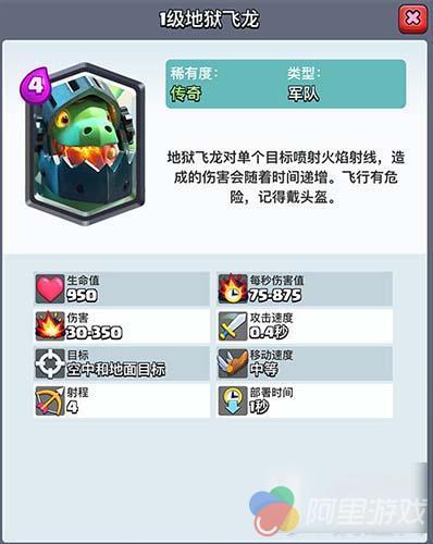 地狱飞龙:传奇卡、4阶解锁、费用4点、空中单位、能对空对地、移动速度中等、射程4、攻击速度0.4秒、部署时间1秒。
