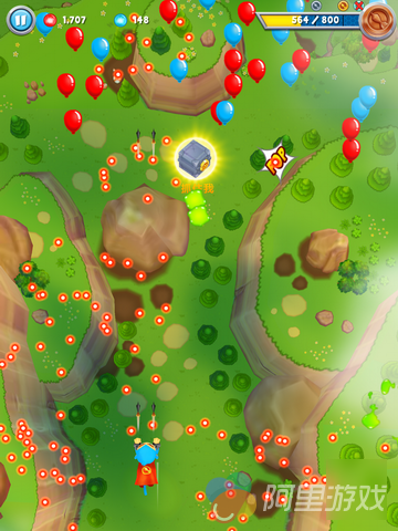 游戏以关卡的形式将玩家的进程分成了几个阶段,在每一关当中,系统会预先为玩家设置好目标,我们只需要完成即可,在游戏过程中,玩家打碎气球还会获得宝箱或者一定的BUFF奖励,这些都能够为我们的游戏提供便利条件,而除了这些之外,游戏中也引入了此类作品普遍使用的“援护”设定,超猴击碎气球有一定几率召唤出特定的随从,这些随从光从出场姿势来看就相当的酷炫,而实战能力更是无敌强,分分钟毁天灭地,因此玩家在游戏过程中要格外注意这些大哥们的动向。
