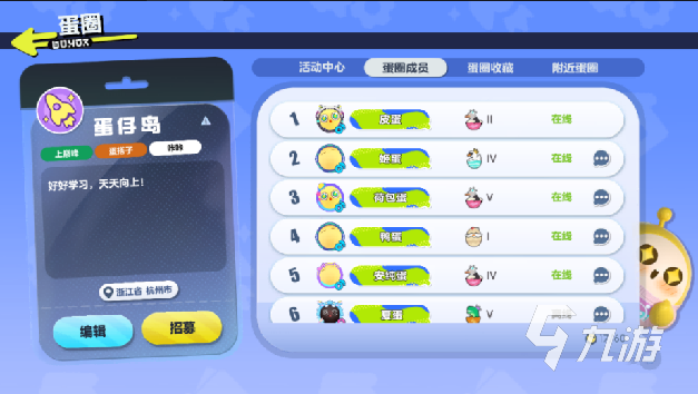 在这里可以拿到一手资料,在蛋圈成员界面可以查看好友的信息,还有在线情况,还能自定义蛋圈的名字,标签,还有宣言,更加的个性化,能招募到更多同道中人,壮大自己的小圈子。