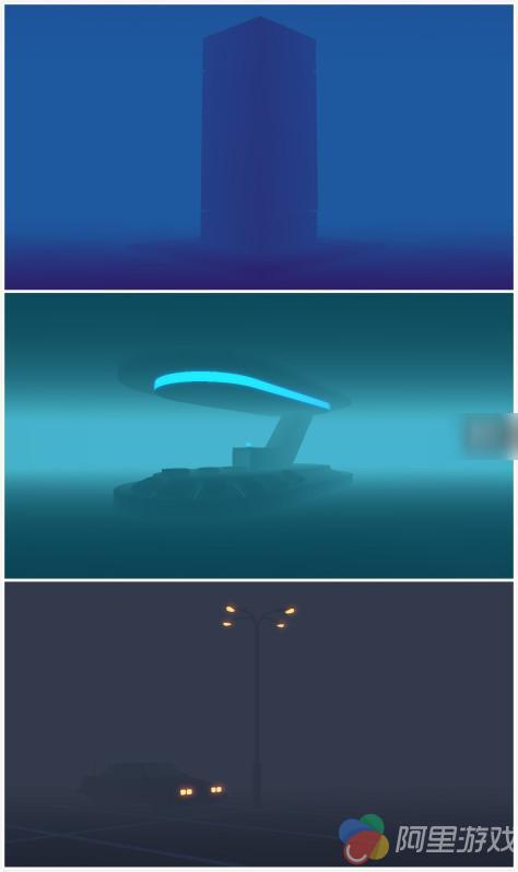 《ISLANDS》中出现的全部10个场景也是这样,没有人的参与;但有了这些“独立”的部分,你就大概就能知道这是一个什么地方,虽然它可能并不是这个地方的标志性成分。比如说游戏中出现了机场行李提取处的履带和机器,停车场中央的一个路灯和渐渐开过来的一辆车,一个巨型电线塔。最初,它们一般都会以一个奇怪的角度突然出现,而你需要通过左右移动来判断它到底是什么,再根据灯光和声音决定下一步怎么做。