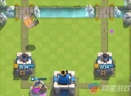 解析:加农炮战车有双层血量,打掉护盾以后便无法移动,所以提前将加农炮战车的护盾消灭可以减轻防守压力。下部队是有延迟的,所以我们要在护卫塔边提前下出冰精灵,这样下出黑骑卡住对手的部队,然后利用滚桶击退效果保护一下黑骑,顺便预判一下对手的后续部队。