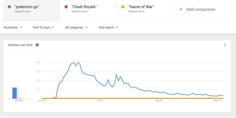 “pokemon go”(蓝色线)谷歌搜索量持续下滑