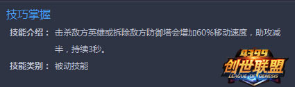 这个技能需要击杀英雄和防御塔来触发,前期对线的时候没什么用,但是如果是遇到对面ADC和辅助的情况下,可以冒险击杀后排ADC,通过击杀后带来的移速来脱离控制。还有就是gank的时候,击杀后能快速的回到自己的线,或者击杀敌方英雄后快速的去其他线路增援。