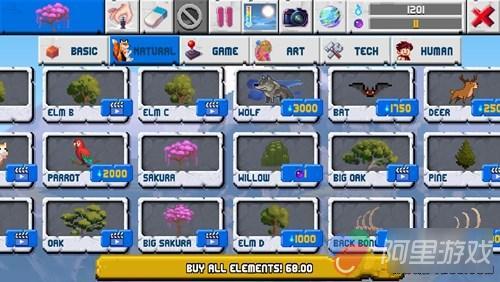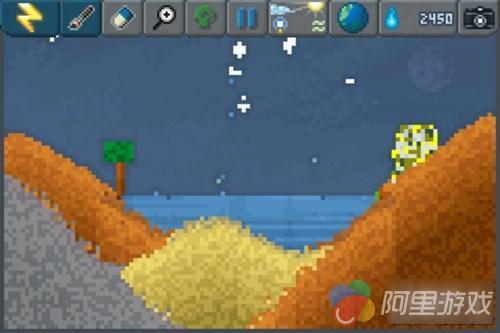 打开游戏后,就是新手教程了。首先是创造水,在元素盒子里面选取水元素,随后在屏幕上拖动水元素,水就会从空散落下来,并在屏幕底部形成了一个湖。如此点击、长按和双指拖动,即可完成大多数操作,很简单嘛!紧接着就是创造大地、树木等等。连我这个沙盒老手都觉得很贴心,点个赞!