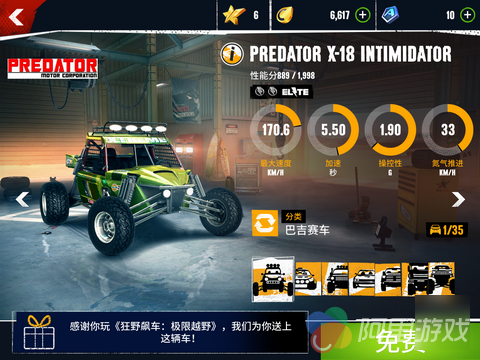 既然游戏的场景全部来到了自然之中,那么相对应的座驾自然也需要更新一下。在座驾阵容方面,本次新作从类型上主要将车辆分为巴吉赛车、拉力赛车、SUV、肌肉车、皮卡、卡车以及怪兽大脚车7种,并且每一种都按照性能的由弱到强分为D、C、B、A、S五个级别。在这些款式当中,Jeep、Ford、Mercedes-Benz、Predator、Dodge、Chevrolet以及大量越野车均已经获得授权并上线,喜欢某个品牌的玩家可以选择购买,当然,游戏中的车辆还可以通过贴纸来展示不同的风格,不过这些贴纸的解锁需要我们参加技巧挑战赛才行。