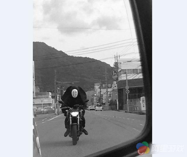无脸男是日本动画大师宫崎骏的电影作品《千与千寻》中的主要角色。无脸男作为最受宫崎骏粉丝们喜爱的角色之一,常常都能在各大漫展或者其他活动上看见他的身影。最近一位岛国小哥就COS起了无脸男,并且还在马路上骑着摩托车,这一图片吸引了不少网友的围观。