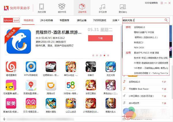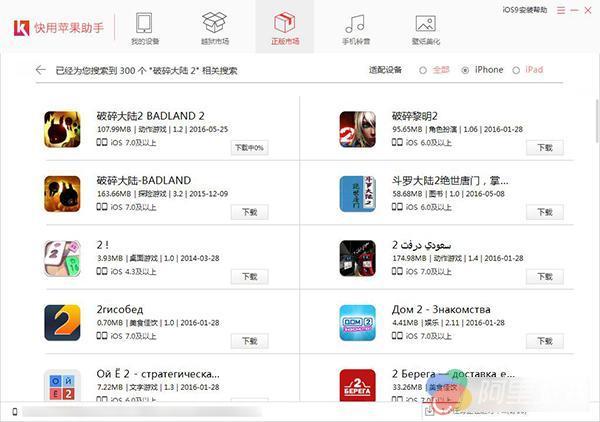 ②在iPhone与电脑连接成功后,打开【快用苹果助手】。再点击【正版市场】,输入【破碎大陆 2】。