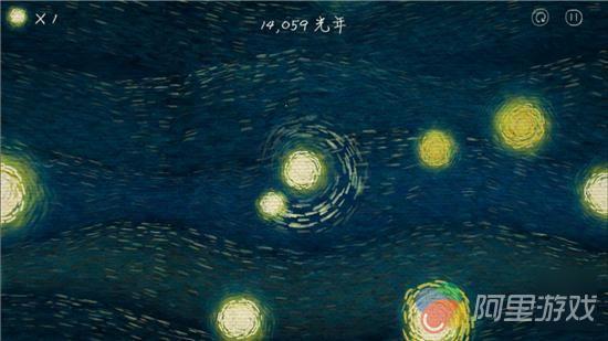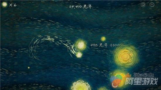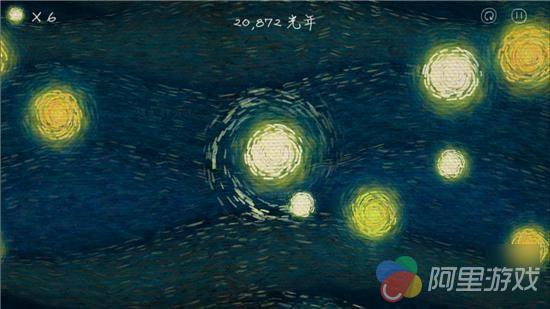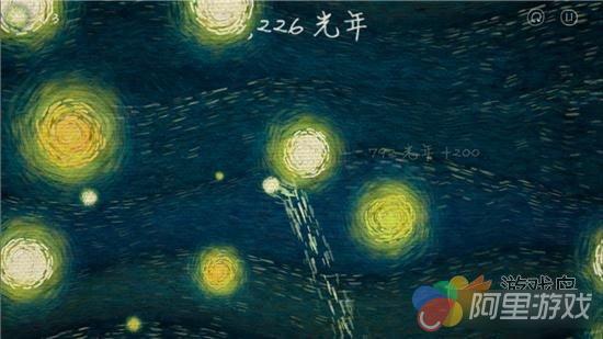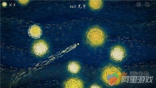 在游戏中可以看到一颗发光小球绕着星星旋转,当其转到合适的位置时我们只需要点击一下屏幕就可以让其飞出,然后沿着飞出的方向一路前行,直至飞到另一颗星球之后便继续保持旋转。在光球飞行的过程中会不断消耗光能,显然它的飞行距离是有限的,一旦超出距离就宣告游戏终结。
