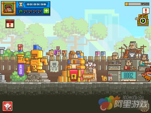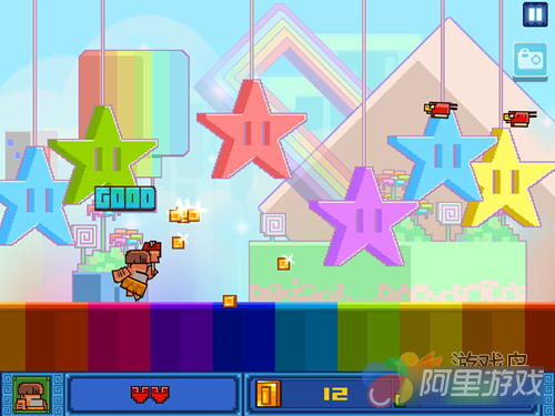 在画面方面,《节奏英雄》采用的是复古的画风,无论是背景,人物,还是“敌人”,全部都是有点夸张恶搞的形象登场,非常的无厘头。《节奏英雄》的音乐非常不错。原创了所有音乐,包括效果音;还在每一个关卡还都设置了特殊的一关,带上一首原创的歌,由北斗企鹅工作室的成员幽舞越山演唱。第一关第一首歌的开头是,“光头走进……”