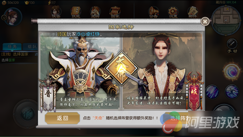 除了做主线剧情任务,支线日常升级外,还有很多精彩的玩法等你参与。升到12级的时会让你选择国家,是参加入晋国还是岐国呢?是不是很难选择?没关系,还有一个办法,那就是天命——听天由命,让系统帮你选择。既不用头条去选择,还能获得额外奖励,何乐而不为呢!加入阵营后,就会开各种阵营任务,30级后还可以参加国战——热血的群体PK。竞技场作为单人PVP玩法当然也是必不可少的。