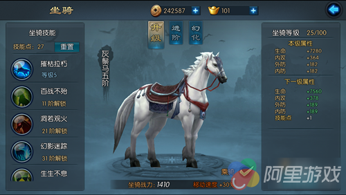 人物养成方面与大多数卡牌游戏相似,等级升级、经脉、武功、装备,每一项培养都能提升角色的综合战斗力。而每个角色拥有多达8个技能,可自由选择技能进行升级培养,并从中挑选4个技能放置战斗技能面板中。根据自己的战斗操作来进行搭配。此外,坐骑技能提升也可增加人物的属性。