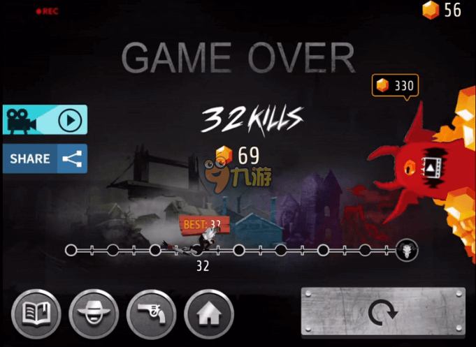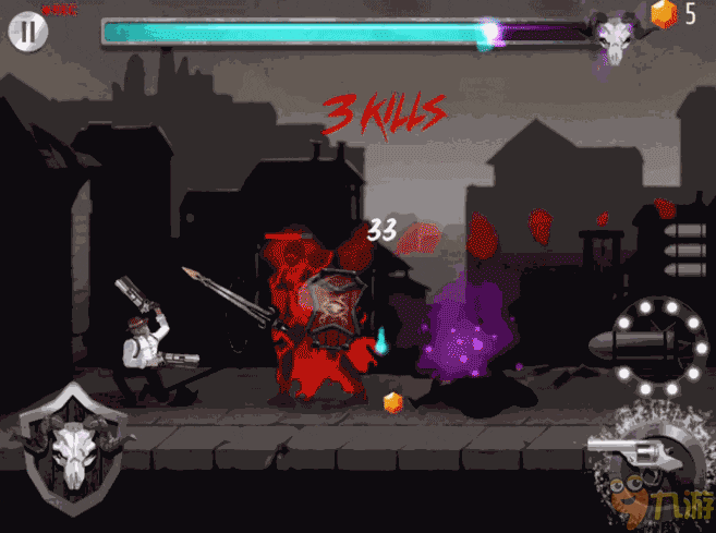 游戏以横版的方式展开,主角只能站在左边抵挡一波又一波的攻击。可以看到屏幕中有三个按钮,右下角的手枪按钮是普通攻击,上面的子弹按钮是特殊攻击,每次普通攻击可以点亮围绕蓄力攻击按钮的一个点,当点亮全部的点,就可以使用特殊攻击,也就是将背部的散弹枪拿下来对着恶魔来一发。