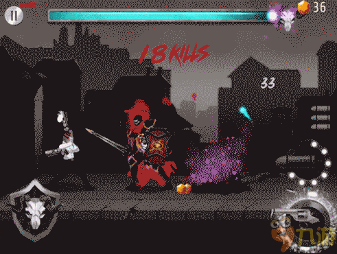 怪物不可能几下就打死,那么我们操纵的角色在恶魔来到身前时该怎么办呢?毕竟我们是不会后退的勇者啊!这个时候屏幕左下角的防御按钮就派上用场了,恶魔进攻时候按下防御按钮能够减少伤害,如果能在恶魔攻击的那一瞬间按下防御,还能进行犀利的反击。玩过《鬼武者》的玩家一定不会陌生,这就是招牌系统“一闪”,防御瞬间反击则是升级版的“弹一闪”, 这种鼓励玩家追求高风险、高回报的设计为玩家带来了爽快、刺激的战斗体验。