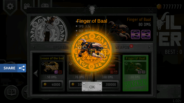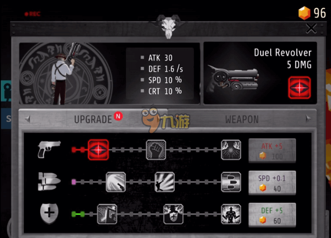 利用获得的金币玩家可以强化主角的能力,能力主要分为攻击、速度、防御三种,玩家可以自行加点,当能力强化到一定程度之后将会解锁新的技能。此外金币也可以用来购买新的武器,当然能力越强大的武器也会越贵。