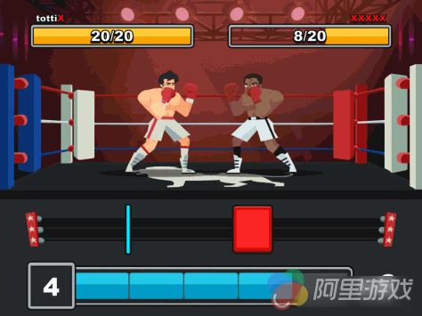 《洛基(ROCKY™)》在玩法上主要分为战斗与养成两个部分,玩家在游戏中将成为一家拳击俱乐部的经理,你需要去招募厉害的拳击手为你而战,最终赢得各项赛事的冠军。游戏采用了点击类的战斗方式,玩家需要通过点击拳台下方不断移动的滚动条来操作你的拳击手,这些滚动条的颜色代表的了不同的动作,比如绿色是出拳、红色是防守等等,当你成功打出连击后还能触发角色的技能,给对手造成重大伤害。不过兔子感觉本作在战斗节奏上的设计有些问题,移动速度极快且数量很多的滚动条经常会让玩家处于手忙脚乱的状况下,每局拳击比赛几乎都是通过瞎按胡打来完成的..