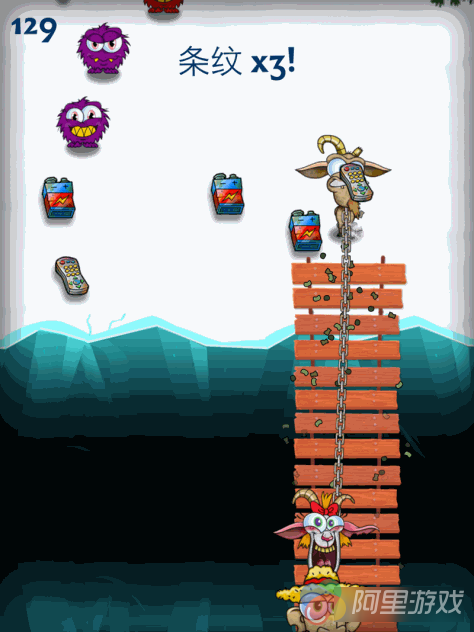 《龌龊的山羊(Nasty Goats)》的玩法十分简单,游戏中你的两只山羊会被一根麻绳连在一起,这也就意味着它们的移动都是同步进行的,玩家则需要让它们在捡垃圾的同时躲开各种障碍物和小妖怪,并不能让身后的农场主追上,当你的山羊碰到障碍物后它们的速度就会受到影响,只要你连撞两次就会被抓到啦。游戏中还会出现很多的猎人陷阱,一旦掉落下去也是会GAME OVER的。