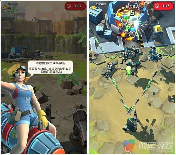 《袭击总部(RAID HQ)》的画面采用3D引擎制作,游戏画风渲染的十分卡通,而且色彩搭配的也很鲜艳明亮,关于海岛的描绘也十分精致,看上去与著名的COC类游戏《海岛奇兵》非常相似,虽然谈不上抄袭但也肯定从中借鉴了不少东西。不过本作最为吸引我的地方还要属它那华丽的战斗场面了,各种弹幕激光满屏乱飞简直爽到不行,BOSS战中大型机甲更是有着压倒性的气势,能让玩家大呼过瘾,而且有一种在玩《魂斗罗》的即视感!毫不夸张的说,本作对于战斗场面的制作已经达到了出类拔萃的地步,当然是相对手游平台而言。