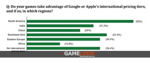 在全球不同区域差异化定价方面,这份调查的结果和上述类似,三分之一的开发者在美国、中国和印度的定价相同,但有31%的开发者会专门为印度制定本地化价格,25%的开发者给中国玩家推出差异化定价,通常比欧美地区更低。