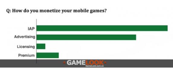 从第一个问题的调查结果来看,趋势很明显,IAP是手游开发商使用最多的货币化模式,而广告仅居其次。付费手游的市场出现了下滑,在被调查的开发者当中,只有不到16%的人使用付费下载模式,70%的受调查开发者使用游戏内广告作为货币化方式,而90%的人使用IAP。